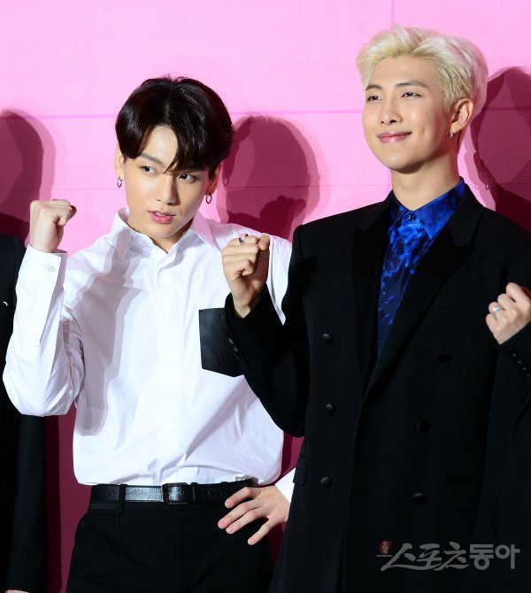 17일 서울 동대문디자인플라자에서 방탄소년단 ‘MAP OF THE SOUL : PERSONA’ 발매 글로벌 기자간담회가 열렸다. 방탄소년단 정국, RM이 카메라를 향해 포즈를 취하고 있다.