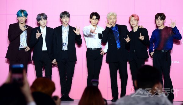 17일 서울 동대문디자인플라자에서 방탄소년단 ‘MAP OF THE SOUL : PERSONA’ 발매 글로벌 기자간담회가 열렸다. 방탄소년단 뷔, 슈가, 진, 정국, RM, 지민, 제이홉(왼쪽부터)이 카메라를 향해 포즈를 취하고 있다.