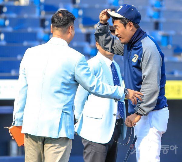 NC 이호준 코치가 이상훈 해설위원(왼쪽)에게 인사를 하고 있다.