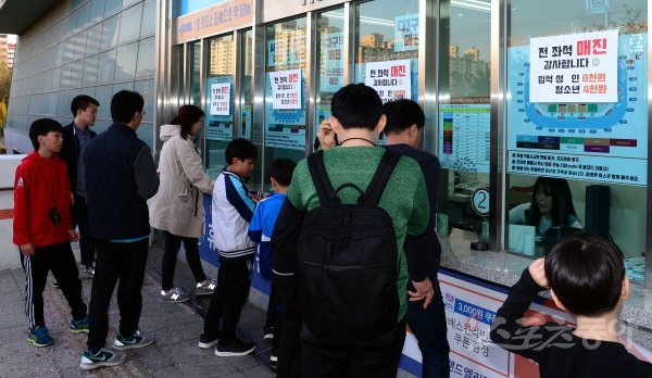 17일 인천 삼산월드체육관에서 열린 ‘2018-2019 SKT 5GX 프로농구’ 인천 전자랜드와 울산 모비스의 챔피언결정전 3차전에서 전 좌석이 매진되어 팬들이 입장권을 기다리고 있다.