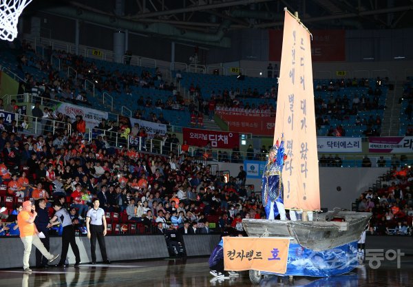 17일 인천 삼산월드체육관에서 열린 ‘2018-2019 SKT 5GX 프로농구’ 인천 전자랜드와 울산 모비스의 챔피언결정전 3차전에서 모형배가 등장하고 있다.