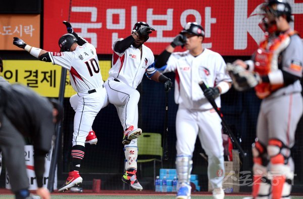 3회말 무사 kt 황재균이 좌월 솔로 홈런을 날린 후 그라운드를 돌아 홈인해 로하스와 기뻐하고 있다.