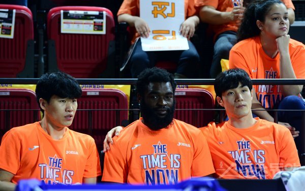 17일 인천 삼산월드체육관에서 열린 ‘2018-2019 SKT 5GX 프로농구’ 인천 전자랜드와 울산 모비스의 챔피언결정전 3차전에서 전자랜드 팟츠가 부상으로 결장한 뒤 경기를 지켜보고 있다.