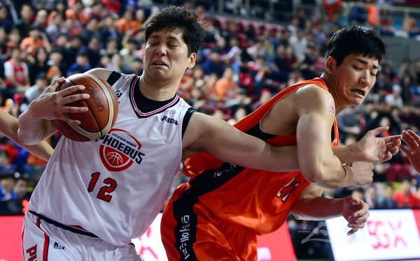 17일 인천 삼산월드체육관에서 열린 ‘2018-2019 SKT 5GX 프로농구’ 인천 전자랜드와 울산 모비스의 챔피언결정전 3차전에서 모비스 함지훈이 전자랜드 이대헌의 반칙을 얻어내고 있다.