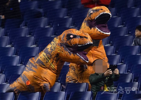 관중석의 한 야구팬이 공룡 마스코트들과 함께 셀카를 찍고 있다.