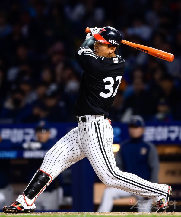 LG 이천웅이 7회초 2사 1,2루에서 적시타를 치고 있다.