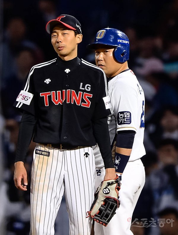 NC 양의지가 8회말 1사 상대 투수의 공에 맞은 후 1루로 출루하며 노려보고 있다.