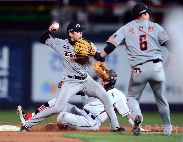 7회말 무사 1,2루 kt 내야 땅볼 때 한화 정은원이 1루주자 황재균을 포스 아웃 시킨 후 1루로 송구하고 있다.