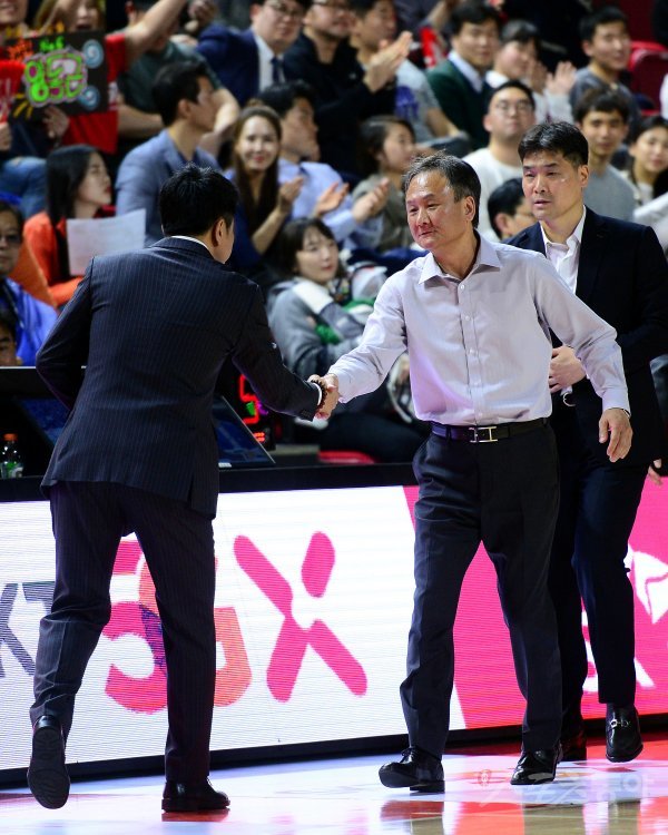 17일 인천 삼산월드체육관에서 열린 ‘2018-2019 SKT 5GX 프로농구’ 인천 전자랜드와 울산 모비스의 챔피언결정전 3차전에서 모비스가 전자랜드에 89-67로 승리한 뒤 모비스 유재학 감독이 전자랜드 유도훈 감독과 악수를 나누고 있다.