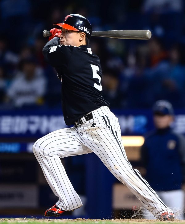 LG 신민재가 연장 11회초 선두타자로 나와 안타를 치고 있다.