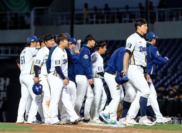 경기 후 NC 선수들이 아쉬운 표정을 지으며 그라운드를 빠져나가고 있다.