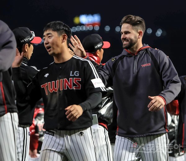 경기 후 6이닝 1실점으로 승리투수 요건을 갖추고 마운드를 내려왔던 LG 켈리가 코칭스태프들과 하이파이브를 하고 있다.
