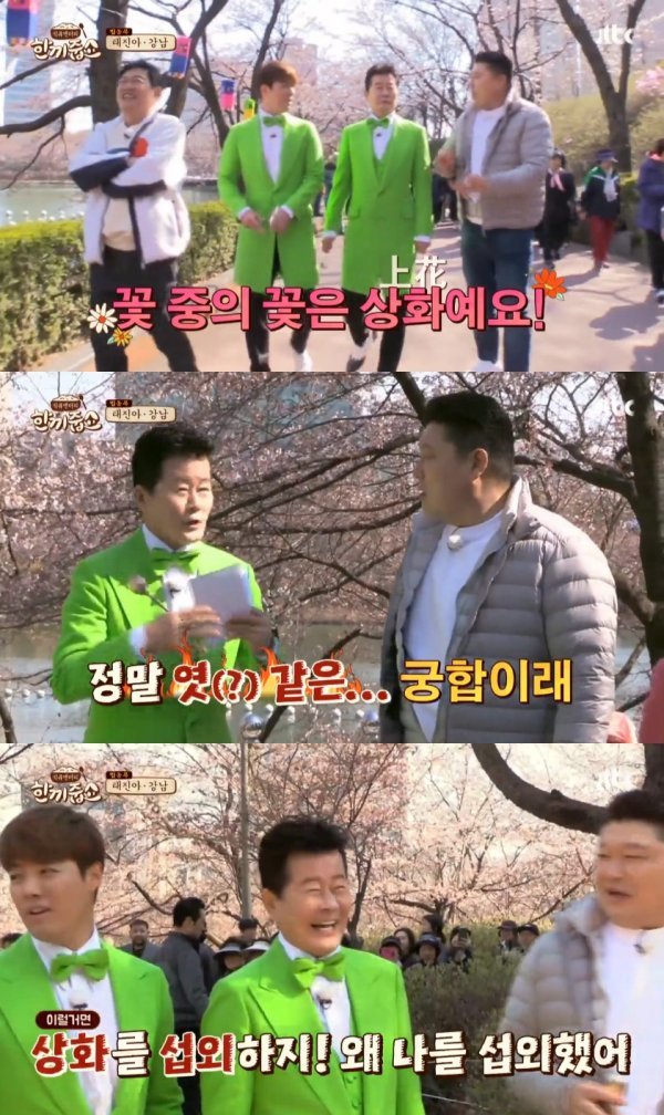 태진아는 자신이 두 사람의 주선자임을 밝히며 “정말 엿 같은 궁합이라고 한다. 우리 방송에 실제로 나왔다”고 말했고, 이경규는 “예전에 이상화가 ‘힐링캠프’에 나왔었다. 그때도 강남의 얼굴이 떠올랐다”고 말해 눈길을 끌었다. 그러자 강남은 “이럴 거면 상화를 섭외하지 왜 나를 섭외했냐”고 말해 웃음을 자아냈다.