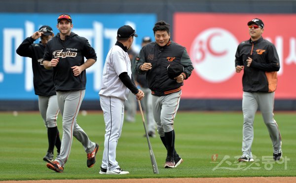 경기를 앞두고 한화 김태균이 kt 박정환 코치에게 인사하고 있다.