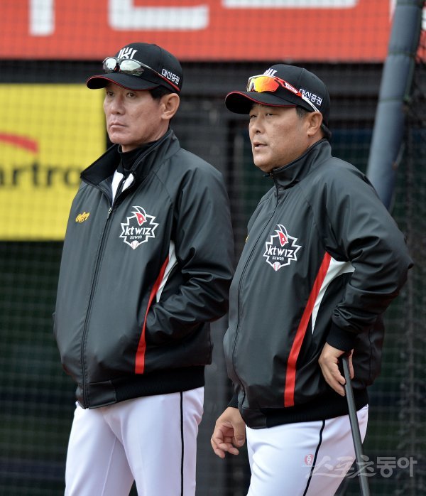 경기를 앞두고 kt 이강철 감독이 김태균 코치와 이야기를 나누고 있다.