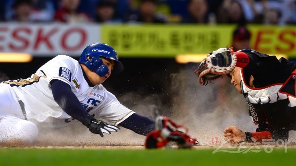 NC 나성범이 1회말 2,3루에서 안타로 홈까지 쇄도했으나 태그아웃 당하고 있다.