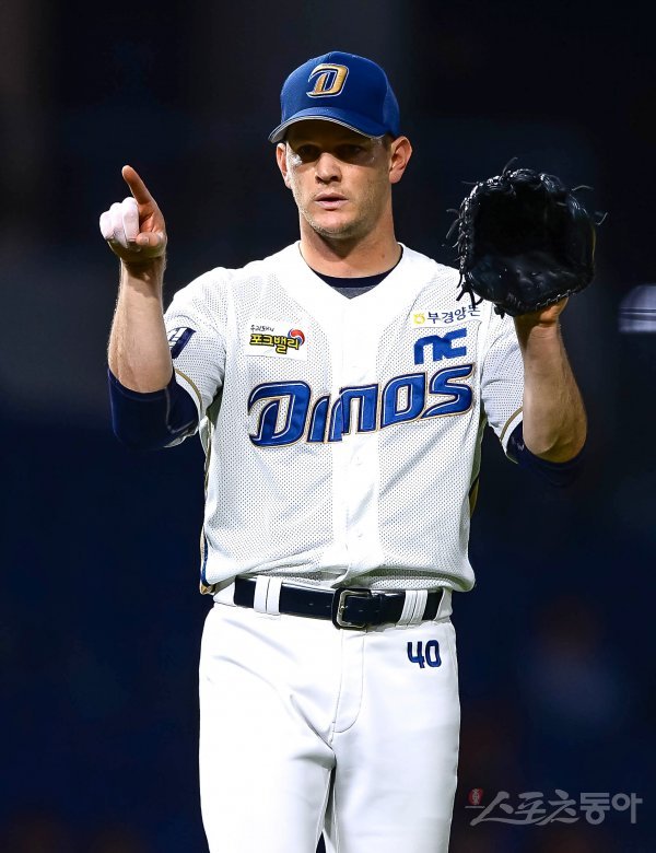 NC 선발 루친스키가 4회초 1사 1,3루에서 상대의 유격수 앞 땅볼 때 2루 주자가 세이프 판정을 받자 비디오 판독을 요청하고 있다.