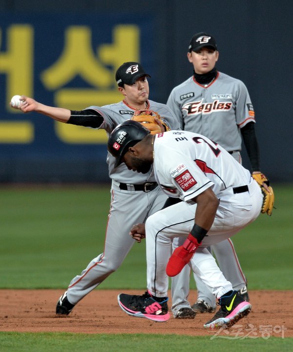 1회말 1사 1루에서 kt 유한준의 내야 땅볼 때 한화 오선진이 1루 주자 로하스를 2루에서 포스 아웃 시키고 있다.