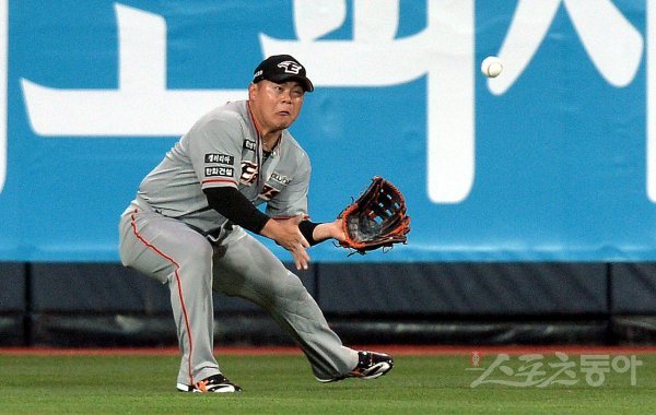 1회말 1사에서 kt 황재균의 타구를 한화 양성우가 잡으려 했으나 볼은 바로 앞에 떨어지고 있다.
