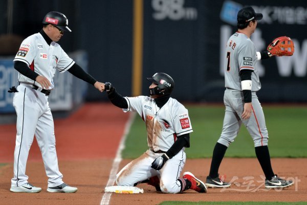 1회말 1사에서 kt 황재균이 3루타를 날린 뒤 한혁수 코치와 하이파이브를 나누고 있다.