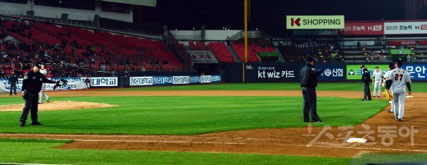 6회말 무사 1루에서 kt 윤석민의 희생번트 때 심판진이 윤석민의 3피트 수비방해를 선언하고 있다.