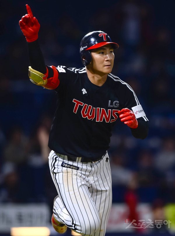 LG 오지환이 8회초 1사 2루에서 역전 투런홈런을 친 후 세리머니를 하며 1루로 뛰어가고 있다.