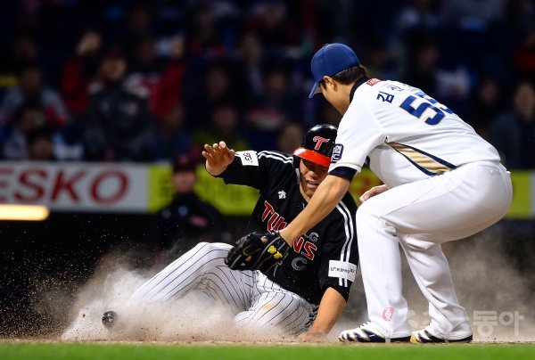 LG 김현수가 8회초 2사 1,3루에서 상대 투수의 폭투를 틈 타 홈까지 쇄도해 세이프되고 있다.