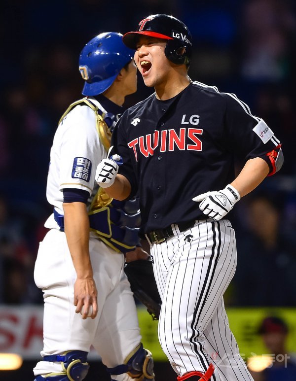 LG 김민성이 8회초 2사 2루에서 개인통산 100호 투런홈런을 친 후 환호하며 홈을 밟고 있다.