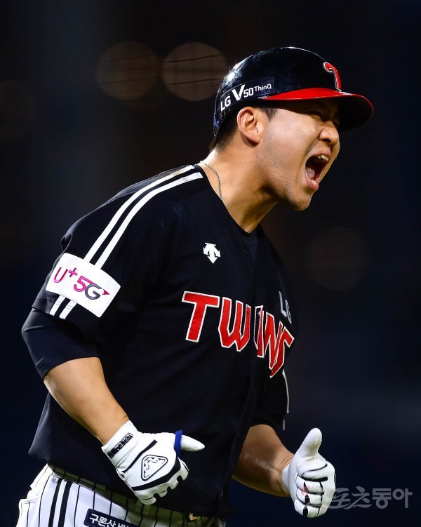 LG 김민성이 8회초 2사 2루에서 개인통산 100호 투런홈런을 친 후 환호하고 있다.
