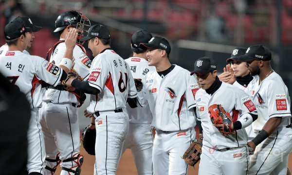 kt가 한화에 6-5로 승리한 뒤 선수들이 그라운드에서 기쁨을 나누고 있다.