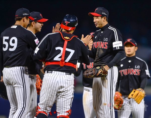 경기 후 LG 선수들이 기쁨을 나누고 있다.