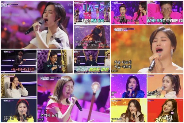 지난 18일 TV CHOSUN ‘내일은 미스트롯’(이하 ‘미스트롯’) 8회 분이 평균 시청률 12.9%(닐슨코리아 유료방송가구 전국 기준)를 돌파, 3주 연속 ‘종편 예능 신기록’ 경신 및 지상파-종편 종합 ‘예능 1위’ 왕좌를 수성하는 기염을 토했다. 최고 시청률은 13.2%까지 치솟았다. 이날 방송에서는 본선 3라운드 ‘군부대 미션’을 통해 12인의 결선 합격자 발표된데 이어 준결승 ‘레전드 미션’ 무대에서 ‘송가인 VS 홍자’구도가 깨지는 상상하지 못했던 ‘반전 결과’가 연속되면서 폭발 직전의 ‘격렬한 트롯 경합’이 벌어졌다.