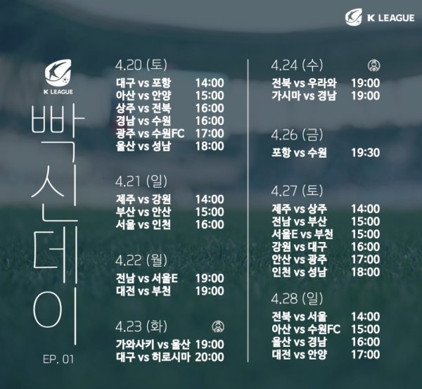 K리그2 '먼데이 나이트 풋볼'과 올 해 신설된 K리그1 '프라이데이 나이트 풋볼'이 동시에 치러지는 첫 주다. 목요일을 제외한 모든 요일에 경기가 치러지는 만큼 축구팬들에게 더욱 다양한 재미를 선사할 수 있을 것으로 기대된다.