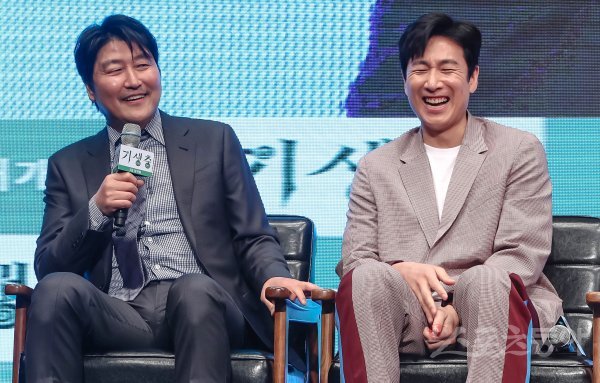 배우 송강호와 이선균(오른쪽)이 22일 서울 중구 소공동 웨스틴 조선호텔 서울 그랜드볼룸에서 열린 영화 ‘기생충’ 제작보고회에서 환하게 웃고 있다.