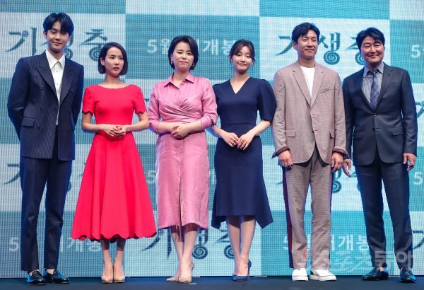 22일 서울 중구 소공동 웨스틴 조선호텔 서울 그랜드볼룸에서 열린 영화 ‘기생충’ 제작보고회에서 출연 배우들이 포즈를 취하고 있다. 왼쪽부터 배우 최우식, 조여정, 장혜진, 박소담, 이선균, 송강호.