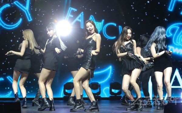 걸그룹 트와이스가 22일 서울 광진구 예스24 라이브홀에서 열린 새 미니 7집 ‘FANCY YOU’ 발매 기념 쇼케이스에서 열정적인 무대를 펼치고 있다.
