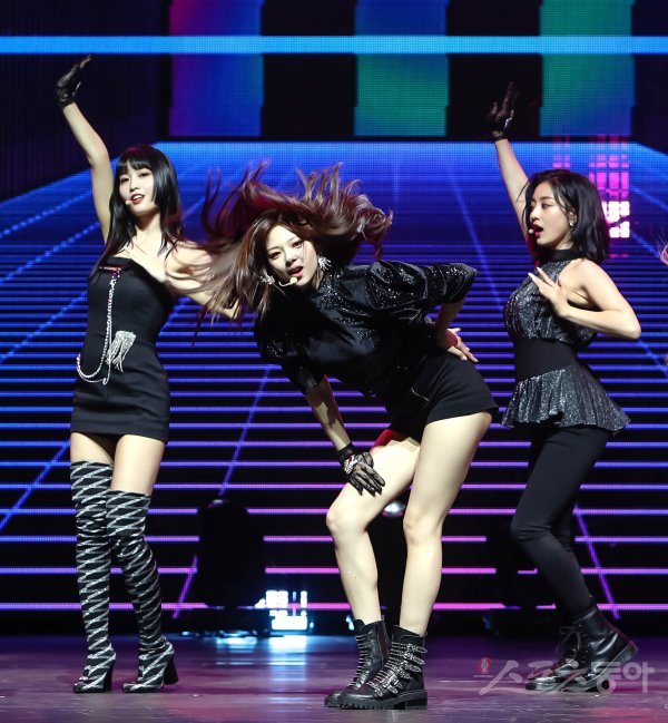 걸그룹 트와이스의 정연(가운데)이 22일 서울 광진구 예스24 라이브홀에서 열린 새 미니 7집 ‘FANCY YOU’ 발매 기념 쇼케이스에서 열정적인 무대를 펼치고 있다.