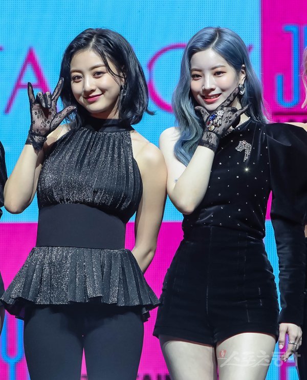 걸그룹 트와이스의 지효와 다현(오른쪽)이 22일 서울 광진구 예스24 라이브홀에서 열린 새 미니 7집 ‘FANCY YOU’ 발매 기념 쇼케이스에서 포즈를 취하고 있다.