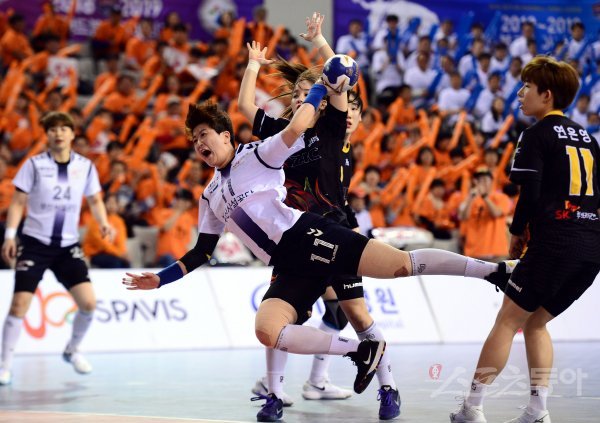 22일 서울 송파구 SK핸드볼경기장에서 ‘2018-2019 SK핸드볼코리아리그’ 부산시설공단과 SK슈가글라이더즈의 여자부 챔피언결정전 3차전 경기에서 부산 류은희가 SK 수비를 피해 슛을 날리고 있다.