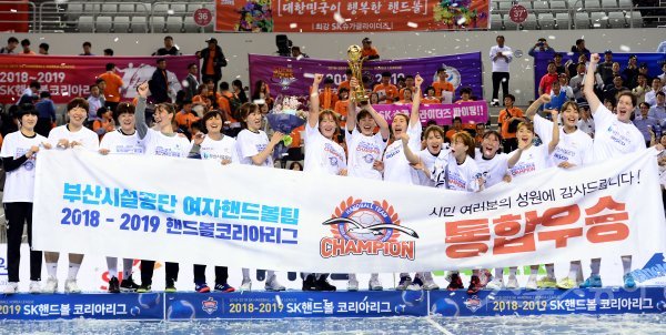 22일 서울 송파구 SK핸드볼경기장에서 열린 ‘2018-2019 SK핸드볼코리아리그’ 부산시설공단과 SK슈가글라이더즈의 여자부 챔피언결정전 3차전 경기에서 부산이 SK에 27-20으로 승리하며 시리즈 전적 2승 1패로 우승을 차지한 뒤 선수들이 기념촬영을 하고 있다.