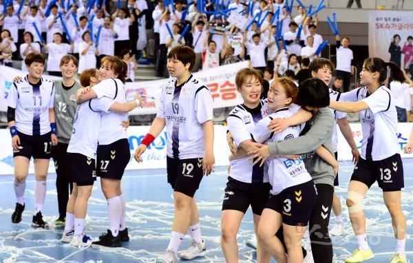 22일 서울 송파구 SK핸드볼경기장에서 열린 ‘2018-2019 SK핸드볼코리아리그’ 부산시설공단과 SK슈가글라이더즈의 여자부 챔피언결정전 3차전 경기에서 부산이 SK에 27-20으로 승리하며 시리즈 전적 2승 1패로 우승을 차지한 뒤 선수들이 기쁨을 나누고 있다.