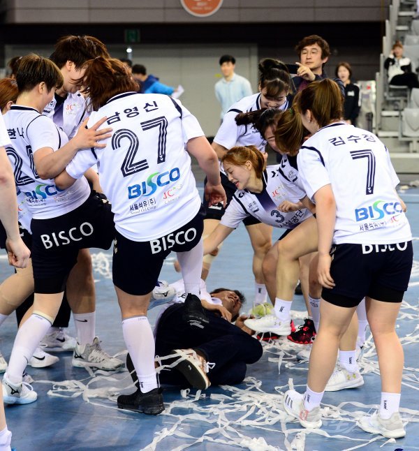 22일 서울 송파구 SK핸드볼경기장에서 열린 ‘2018-2019 SK핸드볼코리아리그’ 부산시설공단과 SK슈가글라이더즈의 여자부 챔피언결정전 3차전 경기에서 부산이 SK에 27-20으로 승리하며 시리즈 전적 2승 1패로 우승을 차지한 뒤 선수들이 강재원 감독에게 세리머니를 펼치고 있다.