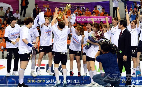 22일 서울 송파구 SK핸드볼경기장에서 열린 ‘2018-2019 SK핸드볼코리아리그’ 부산시설공단과 SK슈가글라이더즈의 여자부 챔피언결정전 3차전 경기에서 부산이 SK에 27-20으로 승리하며 시리즈 전적 2승 1패로 우승을 차지한 뒤 선수들이 기쁨을 나누고 있다.