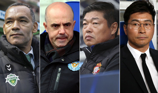 전북 모라이스 감독-대구 안드레 감독-경남 김종부 감독-울산 김도훈 감독(왼쪽부터). 사진|한국프로축구연맹·스포츠동아DB