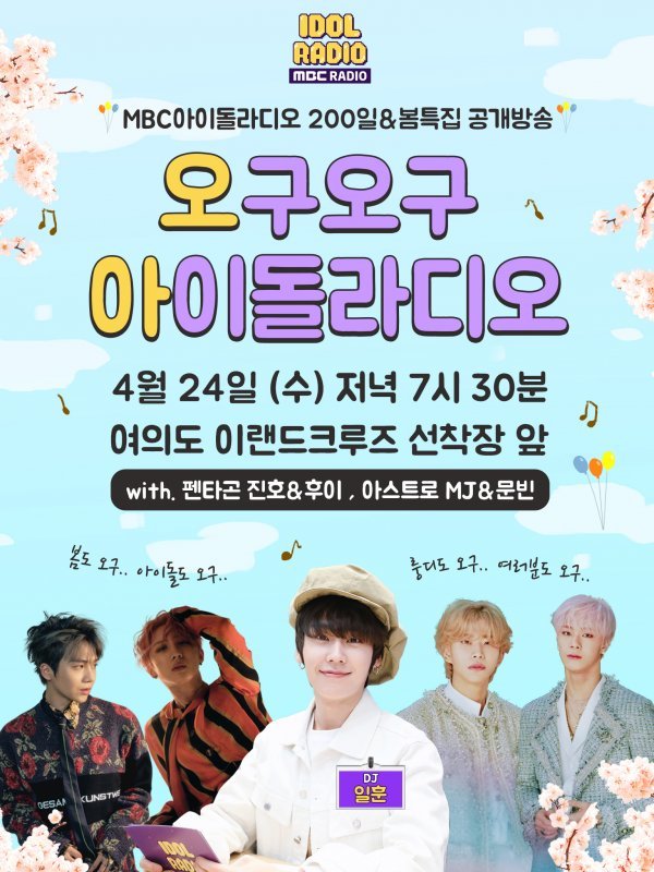 ‘아이돌 라디오’의 DJ 비투비 정일훈 200일 및 봄맞이 특집 공개방송 ‘오구오구 아이돌 라디오! 오아~’가 24일 저녁 7시 30분 서울 여의도 이랜드크루즈 선착장 앞에서 열린다.