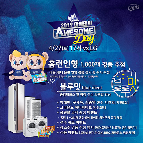 프로야구 삼성 라이온즈가 오는 27일 대구 삼성라이온즈 파크에서 열리는 LG 트윈스와의 홈경기에서 올 시즌 첫 어썸데이를 진행한다. 이는 팬들에게 경품을 나눠주고, 선수와의 스킨십 기회를 제공하는 이벤트다.