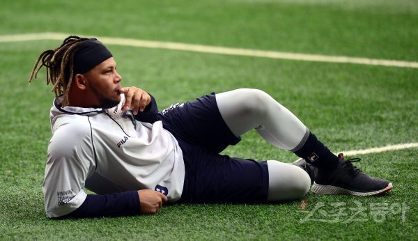 두산 페르난데스가 그라운드에 누워 휴식을 취하고 있다.