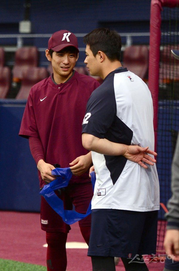 훈련 중 키움 이정후와 두산 김재환이 이야기를 나누고 있다.