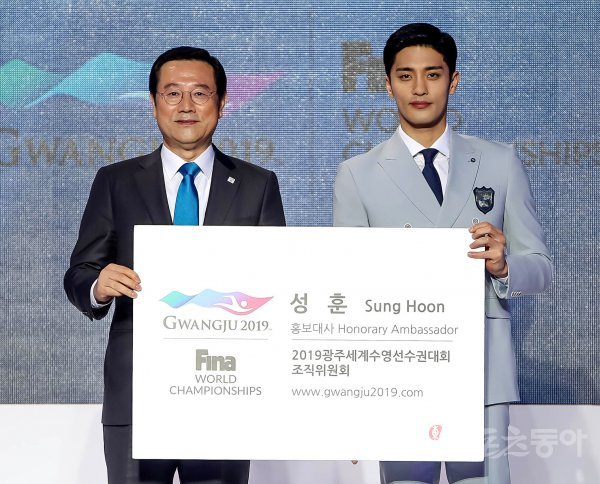 이용섭 광주광역시장과 홍보대사에 위촉된 배우 성훈(오른쪽)이 포즈를 취하고 있다.