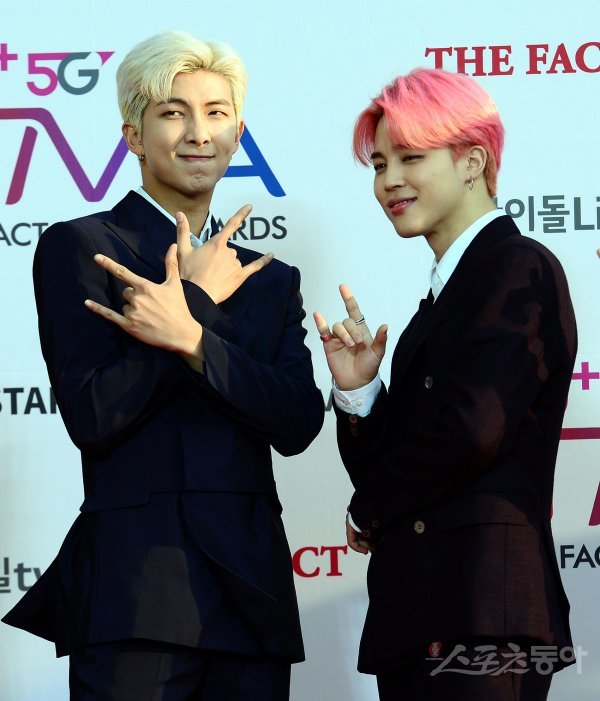 24일 인천 남동체육관에서 열린 ‘더팩트 뮤직 어워드(THE FACT MUSIC AWARDS)’에 참석한 방탄소년단 RM, 지민이 카메라를 향해 포즈를 취하고 있다.